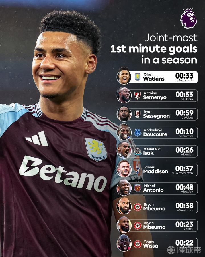 沃特金斯这个进球也创造了本赛季英超联赛的纪录,在之前的赛季中只有2022/23赛季有10个开场第1分钟进球的纪录。而在2024/25赛季英超联赛中,除了沃特金斯,还有多位球员在开场不久就送上了出色的表现。这也充分展现了英超联赛的激烈和令人热血沸腾的竞争。